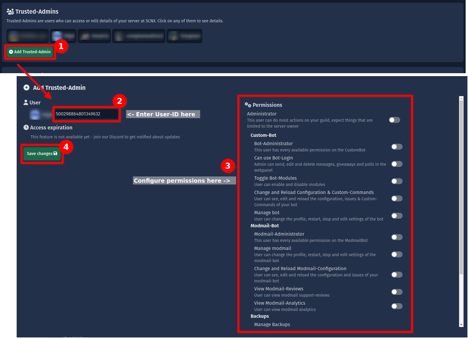Um einen Trusted Admin hinzuzufügen, besuche deine Server Einstellungen Seite in deinem SCNX Dashboard und scrolle zur "Trusted-Admins" Sektion. Als nächstes klickst du auf "Trusted-Admin hinzufügen", um dir den Trusted-Admin-Dialog anzeigen zu lassen. Hier kannst du die Discord-Nutzer-ID des gewünschten Trusted-Admins eingeben und seine Berechtigungen konfigurieren (Bitte lies zuerst den Abschnitt Berechtigungen!). Wenn du fertig bist, speichere die Änderungen, um den Zugriff zu gewähren.