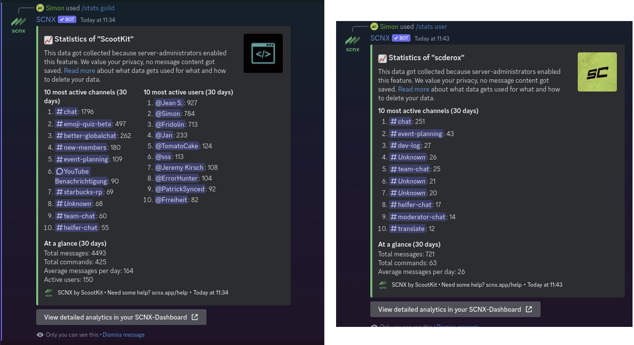 If you (or a user of your server) do not want that the server owner and administrators can view how many messages you sent, or you are worried about personal data being stored about you, you can enable the "Privacy mode" on SCNX using /privacy enable on any server. This global (meaning that SCNX will store no data about you on any server) toggle will affect the following: